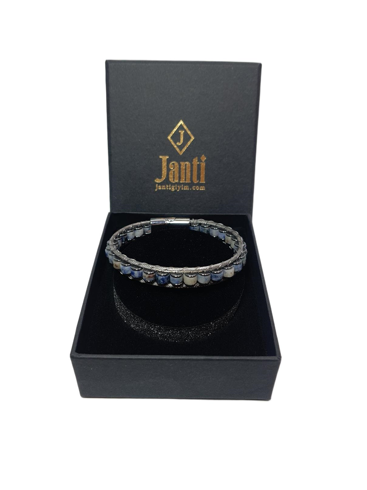 Doğaltaş BileklikJTAW25BLK1612 PASLANMAZ ÇELİK SODALİT ve HEMATİT DOĞALTAŞ MIKNATIS KAPAMA MAVİ-GRİ GARANTİLİ HEDİYE KUTULU JANTİ BİLEKLİKJanti
