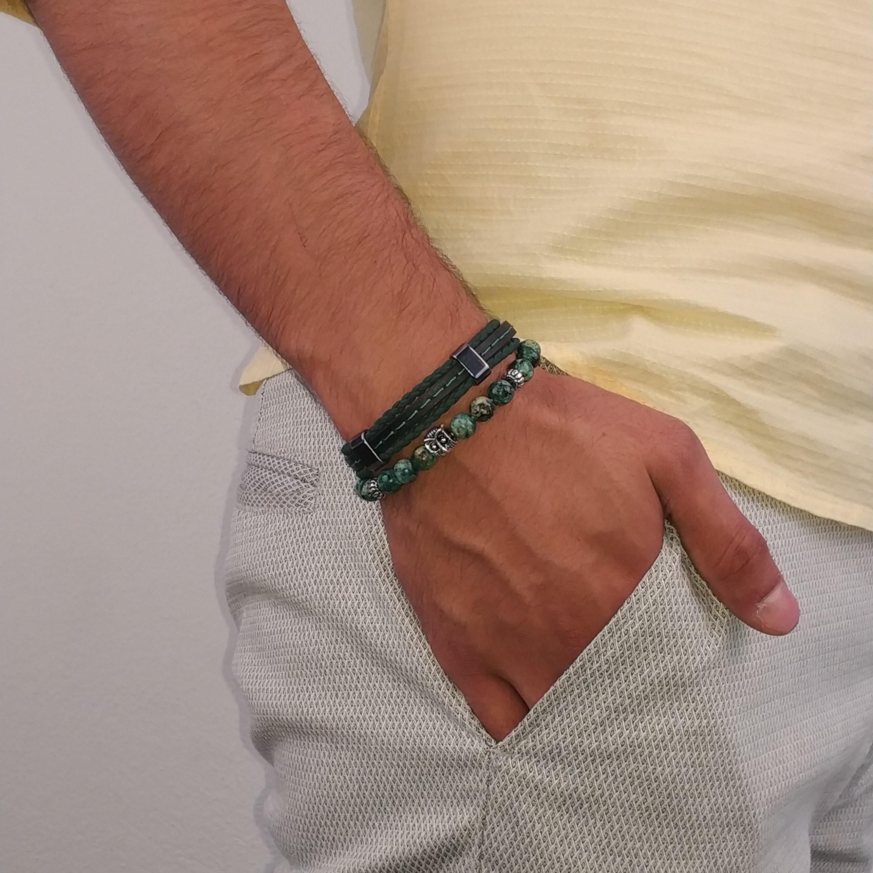* Janti Marka Özel Tasarım Kombin Bileklik * Doğal Taş ve Alaşımlı Metal Malzeme Esnek Bileklik * Doğal taş esnek bileklik yükseklik 8 mm Uzunluk 20.5 cm * Bilek çevresi 17-19 cm olan kişiye uygun olur. * Deri bileklik yükseklik 12 mm Uzunluk 20.5 cm * Bilek çevresi 17-19 cm olan kişiye uygun olur. * Deri bileklik Alaşımlı Metal Malzeme Kanca Kapama * Ürün özelliğinin bozulmaması için Deniz, Havuz, Krem, Parfüm, Alkol, Çamaşır Suyu vb. kimyasal maddelerle temasından kaçınılmalıdır. * Orijinal Malzemeler Kullanılarak Türkiye'de El İşçiliği İle Üretilmiştir.