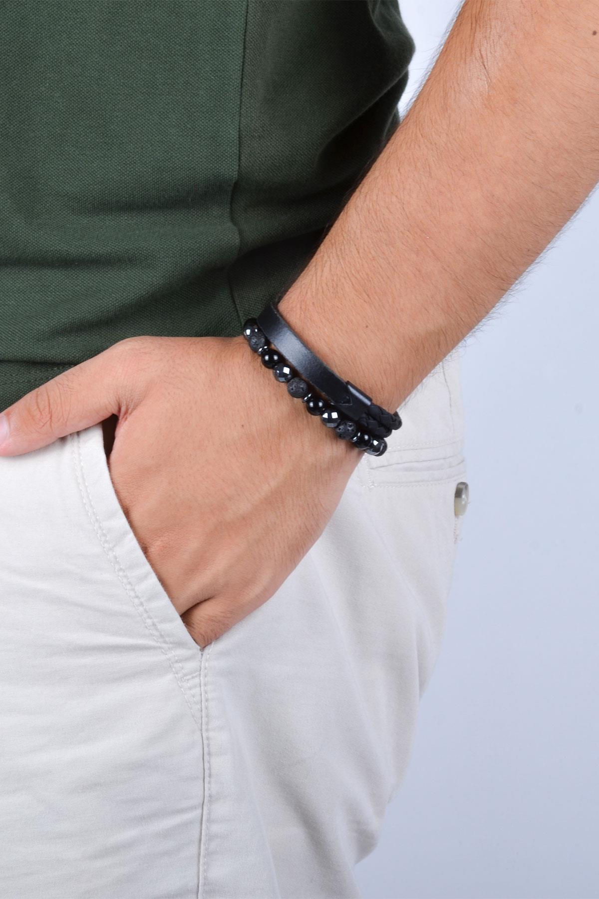 Janti Marka Özel Tasarım 2'li Kutulu Kombin Bileklik. Bu şık ürün Janti Hediye Kutusu ile gönderilecektir. Bileklikler Doğal Taş ve Deri Malzemelerden Üretilmiştir. Bu üründe doğal taş olarak Oniks, Lav ve Hematit Doğal Taş kullanılmıştır. Metal alaşım malzemeler ipc kaplamadır. Doğal Taş Esnek Bileklik Yükseklik 0.8 cm Uzunluk 20.5 cm Deri Bileklik Yükseklik 1 cm Uzunluk 20.5 cm Bileklikler bilek çevresi 17-19 cm olan kişilere uygun olur. Bu ürün orijinal malzemeler kullanılarak Türkiye'de el işçiliği ile üretilmiştir. Ürünün uzun ömürlü olması ve özelliğinin bozulmaması için; Deniz, Havuz, Krem, Parfüm, Alkol, Çamaşır Suyu vb. kimyasal maddelerle uzun süreli temasından kaçınılmalıdır.